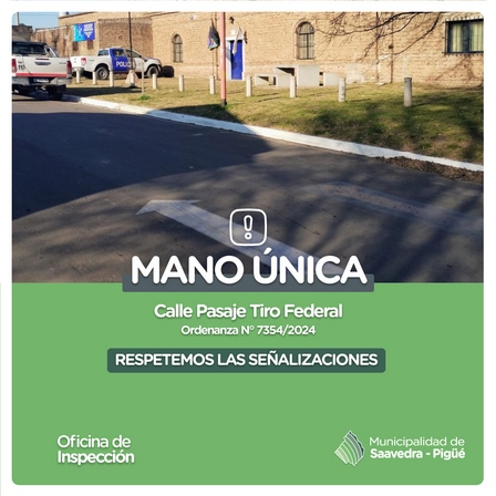 Desde la Oficina de Inspección sostienen que según lo ha establecido la Ordenanza N° 7354/2024 la calle Pasaje Tiro Federal de la localidad de Pigüé es única mano.