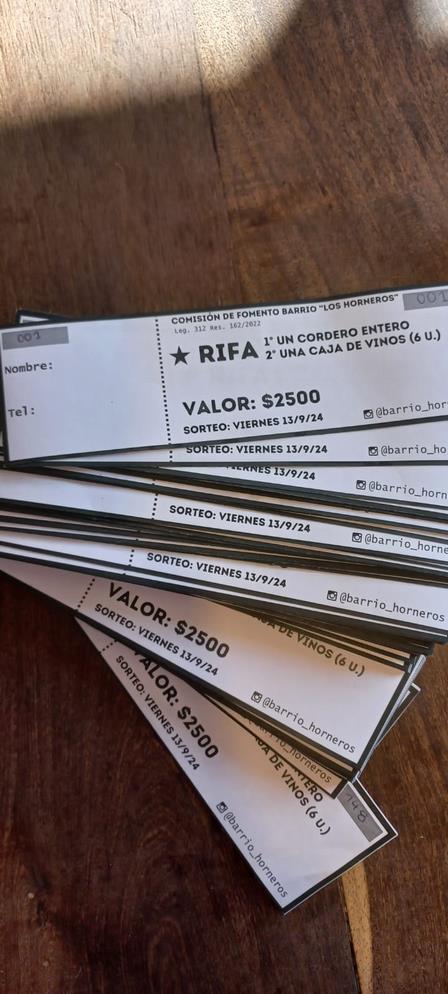 Se trata de una edición de 150 números, a un valor de 2.500 pesos, con el sorteo, para el primer premio, de un cordero, y el segundo, de una caja de vinos, a realizarse el día 13 de septiembre de 2024, y lo recaudado será utilizado para comprar los materiales de los arcos de fútbol que se instalarán en la plaza barrial.