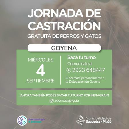 Para el día miércoles 4 de septiembre se prevé desarrollar este tipo de intervenciones, en perros y gatos, gratuitas, en la Delegación Municipal de Goyena.