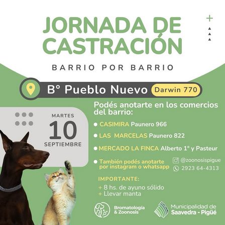 Se llevarán a cabo el martes próximo, 10 de septiembre, por la mañana, castraciones de perros y gatos, en el Salón de la Sociedad de Fomento ubicado en calle Darwin 770 de Pigūé.