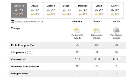 Este miércoles, 25 de diciembre, por la tarde, se estiman unos veintisiete grados centígrados de temperatura máxima en la localidad.