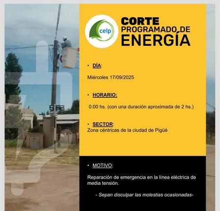 Estiman que el servicio de entrega de energía estará inactivo desde las 0.00 hasta cerca de las 2.00 horas del día miércoles, 17 de septiembre de 2025, en el espacio céntrico de Pigüé.