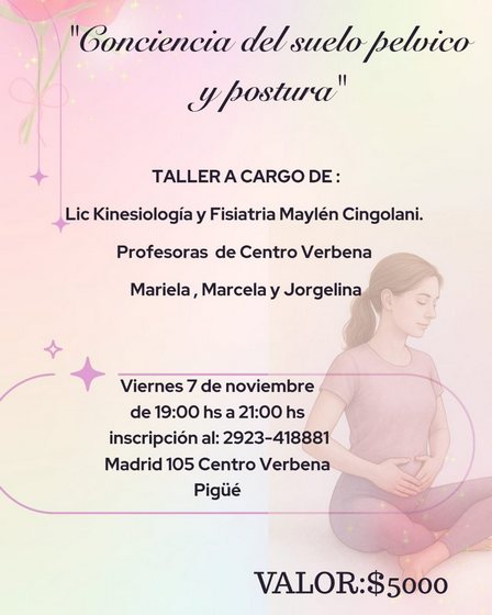 El taller estará a cargo de la Lic. en Kinesiología y Fisiatría Maylén Cingolani, y de las Profesoras del Centro Verbena, Mariela Pazos, Marcela Rojas y Jorgelina Oustry, con inscripciones previas, con un costo de 5.000 pesos, a través del 2923 48 88 81.
