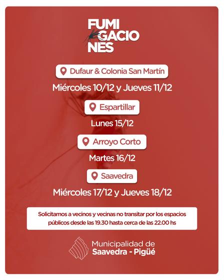 Las fumigaciones se llevarán a cabo hoy, miércoles 10 de diciembre de 2025, Colonia San Martín de Tours y en Dufaur.