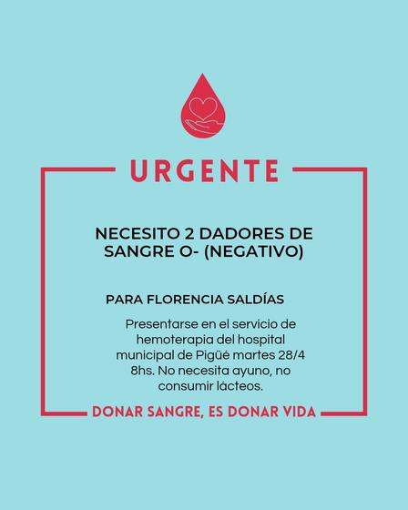 Solicitan 2 dadores de sangre 0 - (Cero Negativo) para Florencia Saldías.