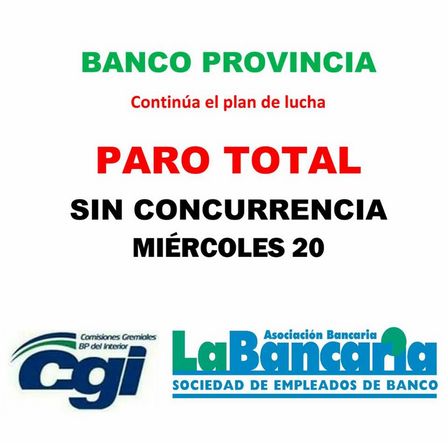 Hoy, miércoles, continuando con el plan de lucha, el Gremio La Bancaria decidió que los trabajadores del Banco Provincia no acudan a las entidades.