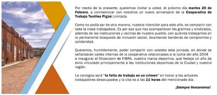 La Cooperativa Textiles Pigüé hará un acto a 14 años de su conformación