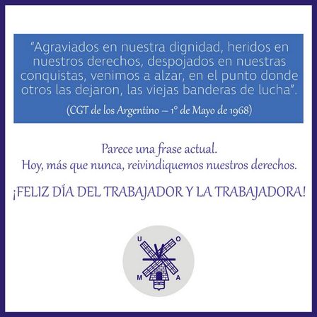 El mensaje manifiesta que "La Unión Obrera Molinera Argentina saluda a los trabajadores en su día porque el trabajo es el motor de la superación para cada uno de nosotros… porque los molineros son parte esencial de la cadena productiva de nuestro país".