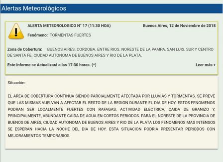 El alerta fue emitido durante el día de hoy, lunes, por el SMN para las próximas horas.