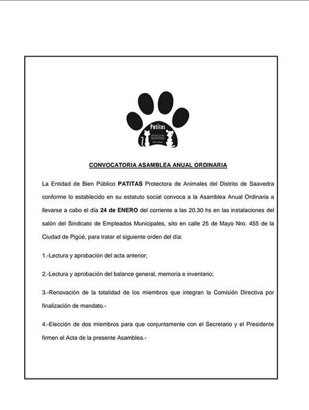 PATITAS está convocando a sus asociados, colaboradores y a quienes deseen sumarse a colaborar con la Institución a la Asamblea Anual Ordinaria a realizarse el día 24 de enero.