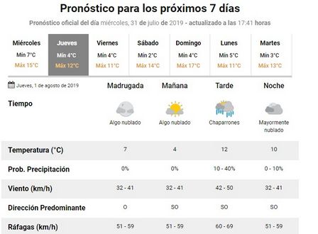 Para la localidad se aguardan vientos con ráfagas de hasta 59 kilómetros la hora.