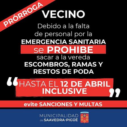 Ante la prróroga del aislamiento decretado por las autoridades continúa la prohibición de sacar a la vereda escombros, restos de poda y ramas.