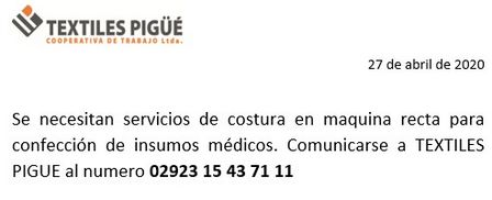 Textiles Pigüé requiere de servicios de costura en máquina recta par la confección de insumos médicos