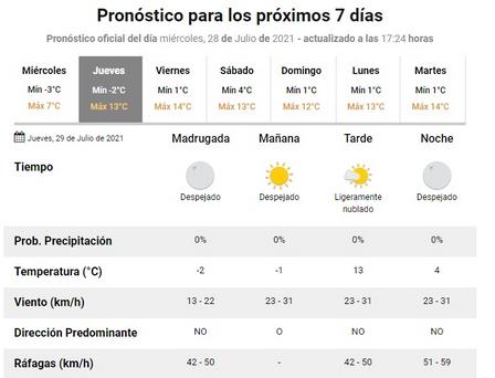 El Servicio Meteorológico Nacional confirmó que el área será afectada por bajas temperaturas, por debajo de valores normales.