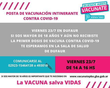 El viernes, por la tarde, se llevarán a cabo inoculaciones en la Sala de la Salud de Dufaur.
