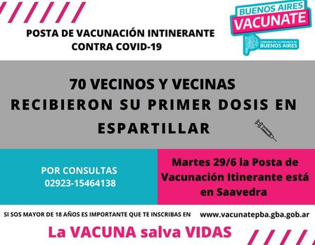 En la localidad de Espartillar la vacunación anti Covid19 se realizó el lunes, desde las 14.00 hasta las 18.00 horas, con habitantes del lugar que acudieron a la Sala de Salud.