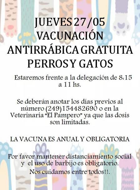 El día jueves, desde las 8.15 hasta las 11.00 horas, frente a la Delegación Municipal, estarán aplicando la vacuna antirrábica gratuita para perros y gatos.