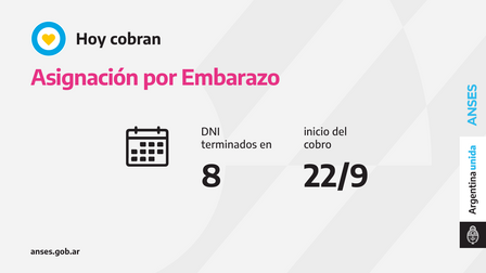 Con la utilización de la tarjeta de débito, hoy, miércoles, cobran la Asignación por Embarazo las titulares con documentos finalizados en 8.