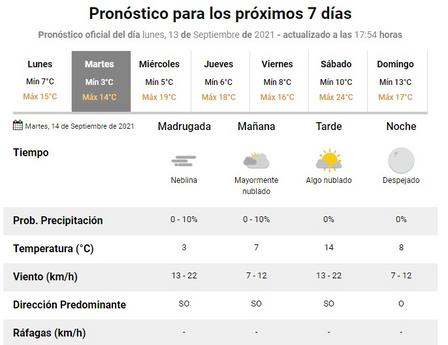 Hoy, martes, en la ciudad, la temperatura más elevada podría alcanzar los catorce grados.