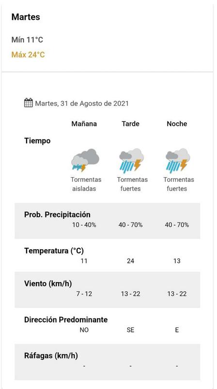 El área será afectada por lluvias y tormentas de variada intensidad, algunas fuertes, pudiendo estar acompañadas de ráfagas, caída de granizo, intensa actividad eléctrica y abundante caída de agua en cortos períodos.