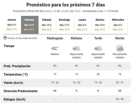 En la ciudad el Servicio Meteorológico Nacional está anunciando una temperatura máxima de veinticinco grados.