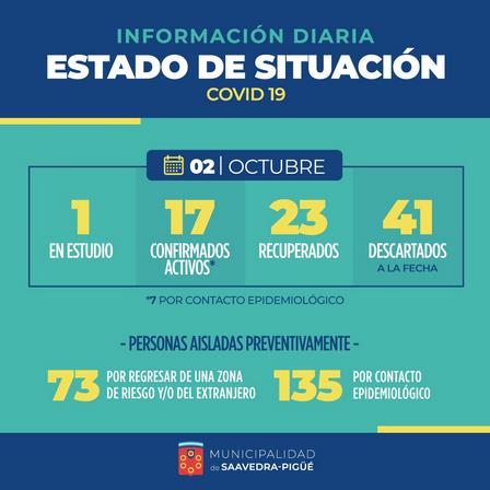 En el Partido de Saavedra presentaron el reporte diario de la pandemia que corresponde al resumen del 2 de octubre por la noche.