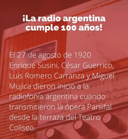 Allí se acota que “el 27 de agosto de 1920 Enrique Susini, César Guerrico, Luis Romero Carranza, y Miguel Mujica dieron inicio a la radiofonía argentina cuando transmitieron la ópera Parsifal desde la terraza del Teatro Coliseo”.