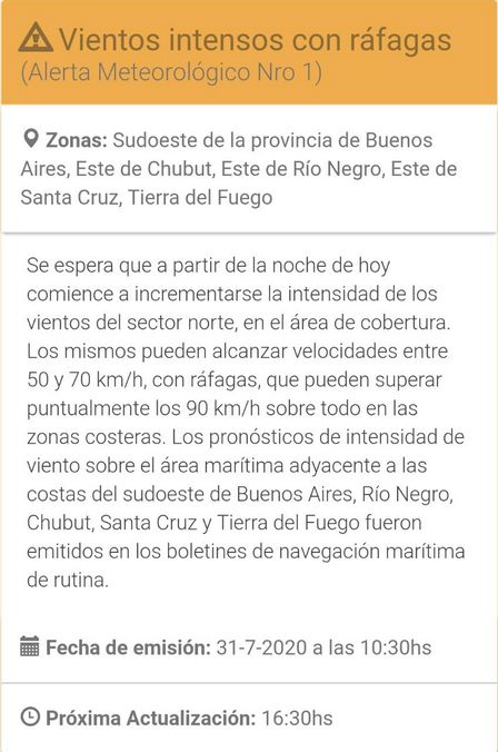 El Servicio Meteorológico Nacional está dando a conocer un nuevo un alerta meteorológico por intensos vientos parea la zona.