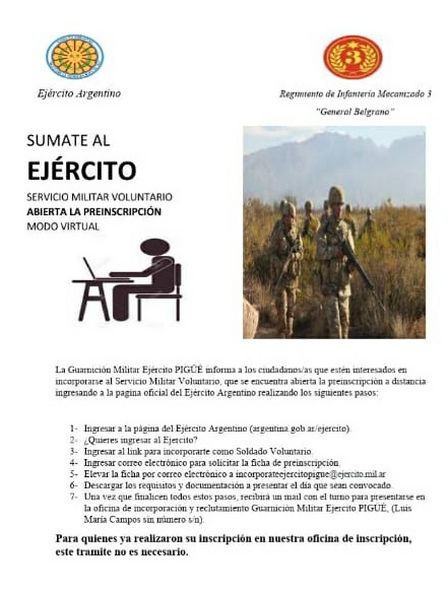 Difundieron, desde la Guarnición Militar Pigüé, siete pasos a seguir por los aspirantes e interesados a sumarse a esta convocatoria.