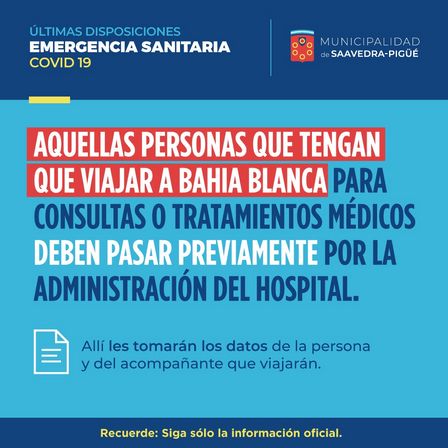Las personas que deban viajar a Bahía Blanca deberán acercarse previamente a la administración del Hospital Municipal de Pigüé o bien a las Salas de las localidades del distrito.