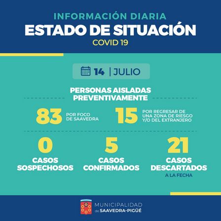 El reporte del martes 14 de julio indica que hay aún 5 casos confirmados de Coronavirus en el Distrito de Saavedra.