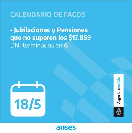 Este lunes 18 de mayo, hoy, las entidades bancarias atenderán el pago correspondiente a mayo de jubilaciones y pensiones de hasta $17.859, con DNI terminados en 6.