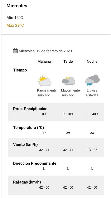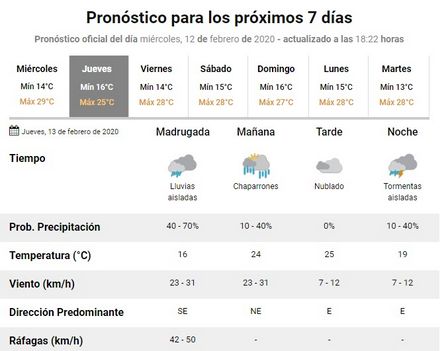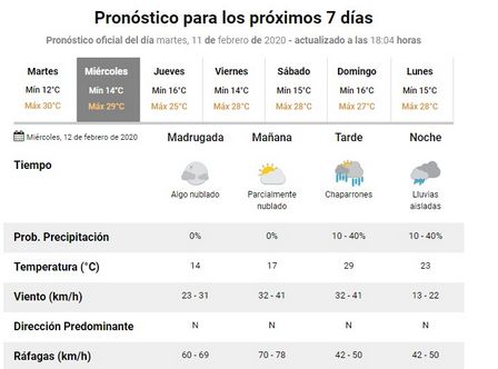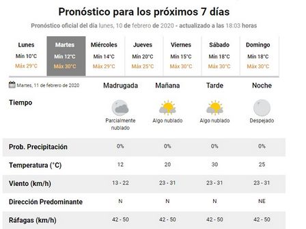 Para el día de hoy, martes, el Servicio Meteorológico Nacional anunció, en la ciudad, unos treinta grados de máxima.