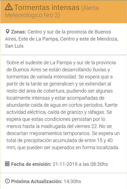 El alerta meteorológico está siendo anunciado por el Servicio Meteorológico Nacional.