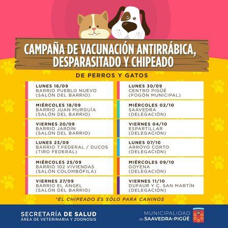 Este lunes que se avecina, en el Barrio Pueblo Nuevo, habrá aplicaciones a cargo de personal del Área de Veterinaria y Zoonosis del Municipio.