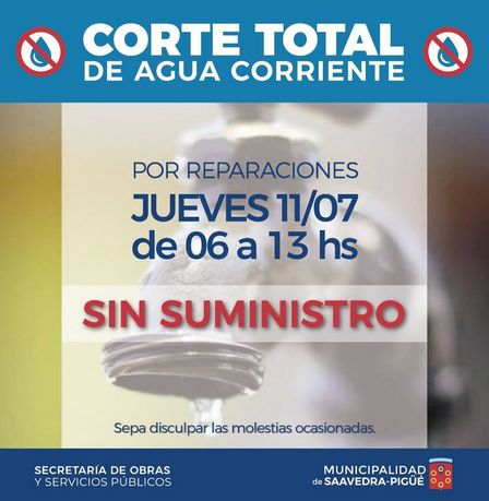 Desde las 6.00 hasta las 13.00 efectuarán un corte general en la localidad