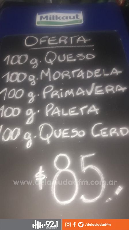 Lo de Cafecito Minimercado tiene a 85 pesos los 100 gramos de queso, más 100 gramos de mortadela, más 100 gramos de primavera, más 100 gramos de paleta, más 100 gramos de queso de cerdo.