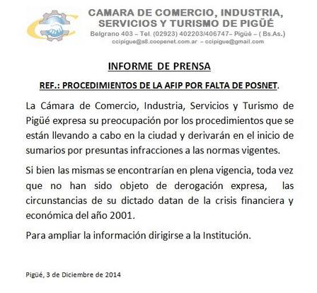 El comunicado fue difundido hoy con el propósito de poner de manifiesto los procedimientos de la AFIP por falta de posnet.