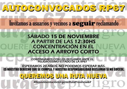 Este sábado, a las 12.30 horas, se hará una nueva manifestación solicitando por la Ruta Provincial Número 67.