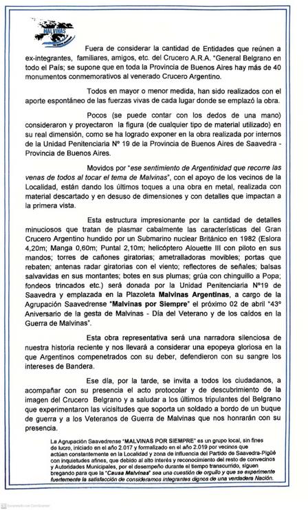 Esta estructura será colocada, el día 2 de abril, en la Plazoleta Malvinas Argentinas de la localidad de Saavedra.