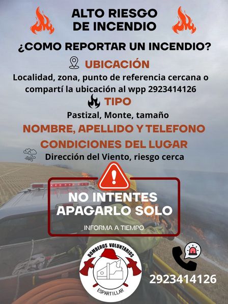 El contacto, para aportar información a los Bomberos Voluntarios de Espartillar, es 2923 41 41 26.