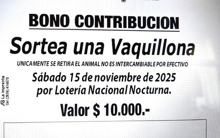 El sorteo de una vaquillona, que no es intercambiable como premio por dinero en efectivo, se hará el día 15 de noviembre de 2025 por la Lotería Nacional Nocturna.