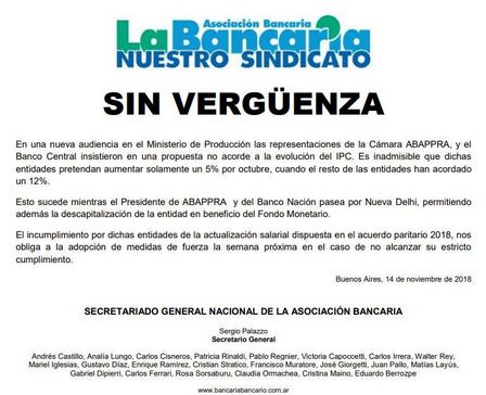 El documento publicado por el gremio de los trabajadores de bancos expresa que 'la Cámara ABAPPRA y el Banco Central insistieron en una propuesta no acorde a la evolución del IPC.
