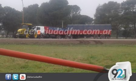 En la mañana de ayer una maquinaria debió colaborar con un camionero que sufrió inconvenientes frente al Autódromo Ciudad de Pigüé cuando su unidad de cargas pesadas quedó encajada.