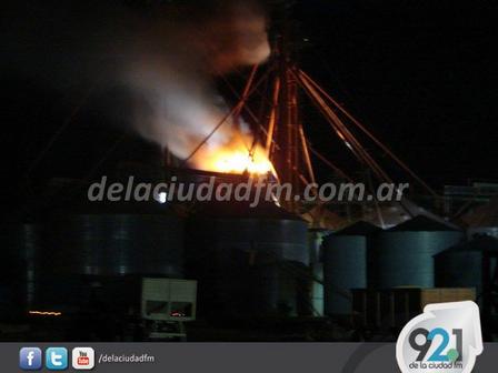 En el predio del Parque Industrial los Bomberos combaten el incendio que afecta la secadora de Semillera Ceres.