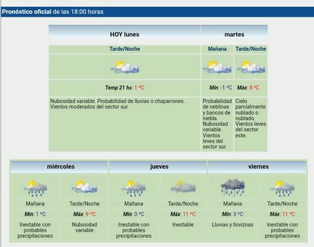 En el caso del martes se prevén heladas, mientras que, para los días miércoles, jueves, y viernes, se esperan lluvias.
