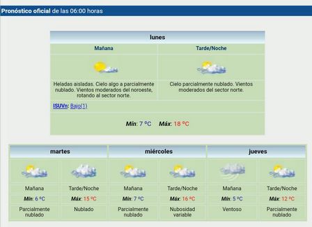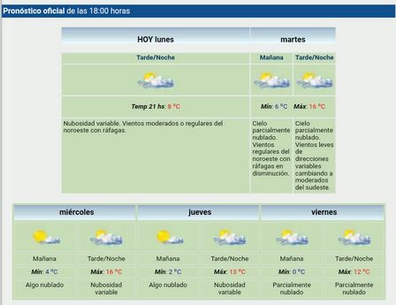 Durante el día de hoy, lunes, según el Servicio Meteorológico Nacional, se espera una máxima de dieciocho grados.