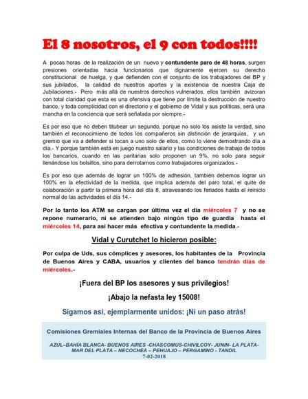 Así lo confirmaron integrantes del Gremio La Bancaria ratificando la continuidad del plan de lucha.
