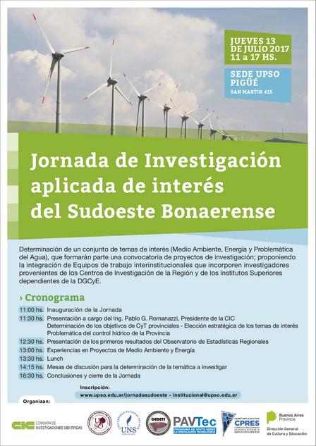 Este jueves, desde las 11.00 hasta las 17.00 horas, en el Aula Magna de la Universidad Provincial del Sudoeste, tendrá lugar la Jornada de Investigación Aplicada de Interés del Sudoeste Bonaerense.