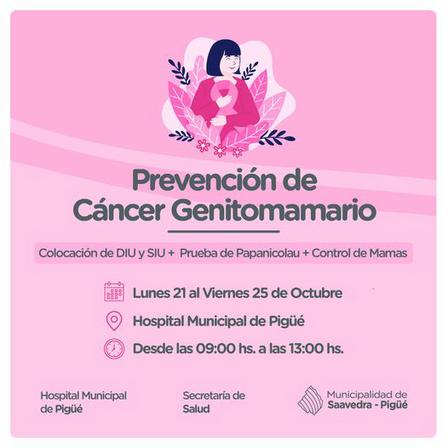 A partir del día de hoy, lunes, desde las 9.00 hasta las 13.00 horas, se llevará a cabo acciones para prevenir el cáncer génitomamario en el Hospital Municipal de Pigüé.